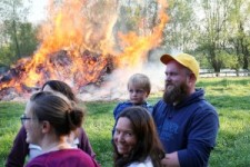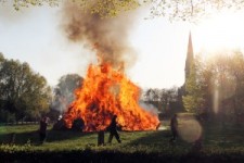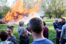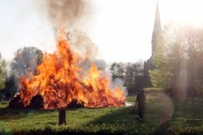 Um kurz vor sieben am Ostersonntag rücken sie noch die Tische zurecht auf dem Hof des Bürgerhauses: Von hier hat man den direkten Blick auf den Haufen an Baum- und Strauchschnitt, der über die Woche aufgetürmt worden ist auf der Wiese zwischen Bürgerhaus und Pfarrkirche. Der Turm von Sankt Christophorus glitzert in der Abendsonne, und die scheint einem geradewegs und mit Wonne ins Gesicht. Endlich wieder T-Shirt-Wetter: So darf’s bleiben, das finden alle, die jetzt nach und nach eintrudeln – die einen kommen aus dem Gottesdienst mit Pfarrer Reinhold Frickenstein, die anderen von zuhause. Viele Steppkes sind dabei: Osterfeuer anschauen, das Holz prasseln hören, das wird spannend! Und die Feuerwehr ist ja auch noch da – da kann man sich gleich alles zeigen lassen!